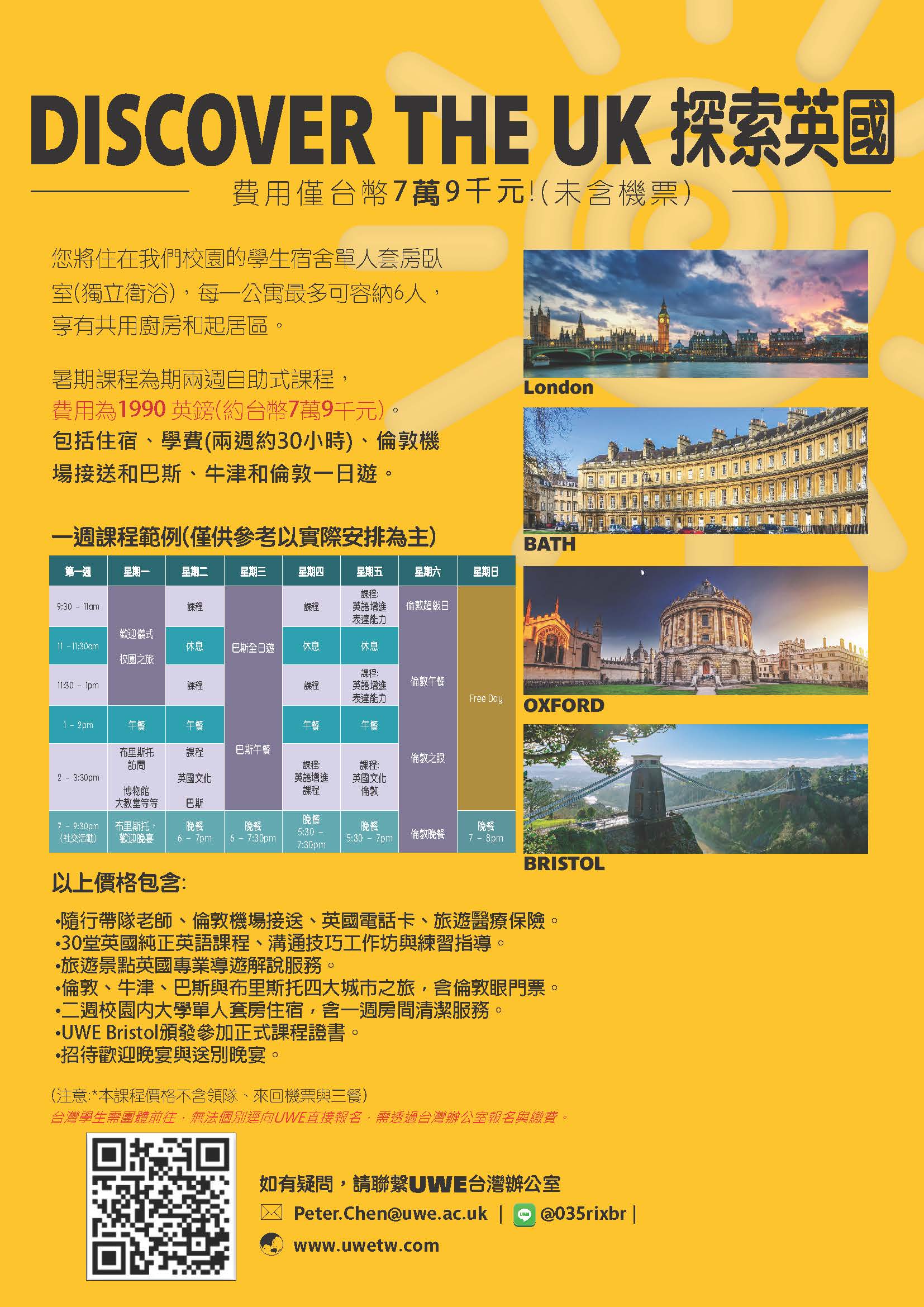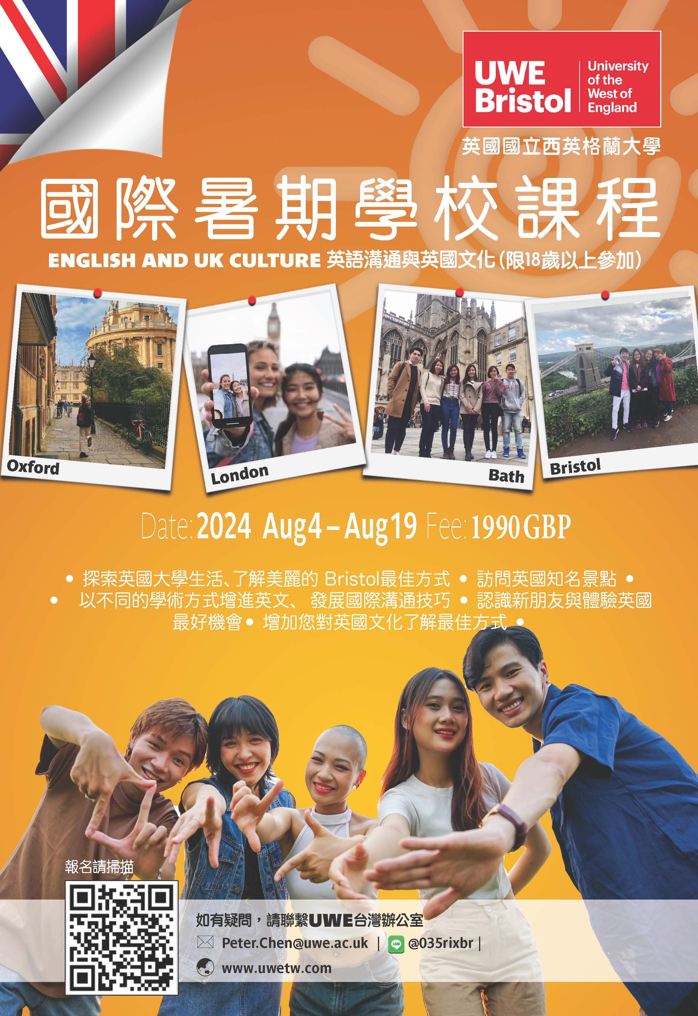 英國國立西英格蘭大學(University of the West of England,UWE )主辦英國『2024國際暑期學校International Summer School英語與文化課程』,提供二週30堂課程+倫敦機場接送+走訪英國四大城市(倫敦、牛津、巴斯與布里斯托) +UWE校園單人套房住宿+UWE Bristol大學頒發參與證書。費用由UWE部分贊助,僅需1,990英鎊(約台幣7萬9千元,未含機票、三餐)。名額有限,敬請 協助公告海報,並鼓勵對英語及英國文化有興趣的同學把握全球限額,額滿即止,請盡速申請。報名請掃描海報QR CODE。(本次限18歲以上同學參加,全台灣限額40名)。