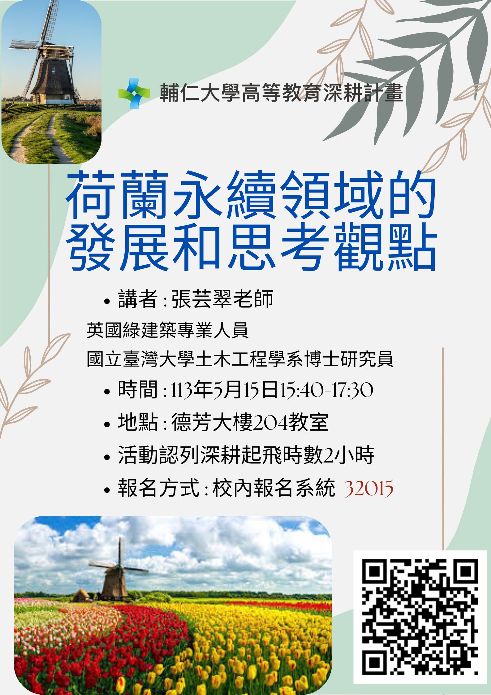 聯合國永續發展目標SDGs(Sustainable Development Goals)是世界各國近年來都很重視、推動的目標。在台灣,輔仁大學也積極參與、推動建構永續校園生活的目標。本次講座敬邀張芸翠老師介紹荷蘭永續發展領域的發展及思考觀點,期待集思廣益,激起更多的火花。講者: 張芸翠老師