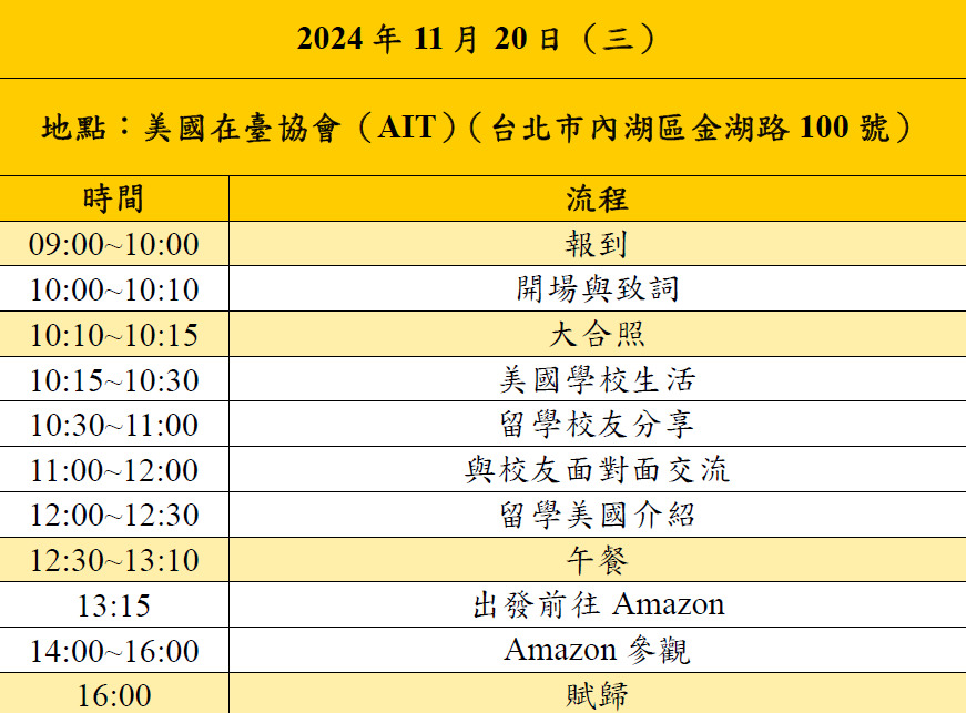 - 本活動係由本會及美國在臺協會(AIT)合辦,本(2024)年11月20日(三)於美國在臺協會(AIT)舉行(地址:台北市內湖區金湖路100號),活動內容包含美國大學資訊分享、知名美國大學校友座談與美國企業Amazon參訪。